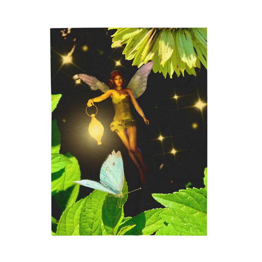 Fairy And Blue Butterfly In A Flower Garden- Velveteen Plush Blanket
