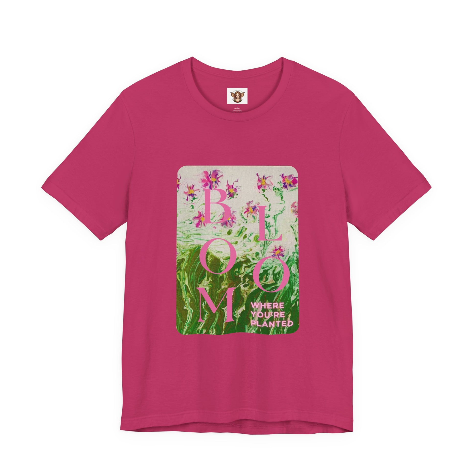 This classic unisex jersey short sleeve tee features a pretty pink flower painting with the inspirational quote "bloom where you're planted." Perfect for nature lovers and those who enjoy a touch of positivity in their wardrobe. Can be worn casually or layered for a stylish look. Great for garden lovers and anyone who appreciates floral designs. Soft cotton and quality print make users fall in love with it over and over again. These t-shirts have-ribbed knit collars to bolster shaping. The shoulders are tapered for a better fit over time. Dual side seams hold the garment's shape for longer.