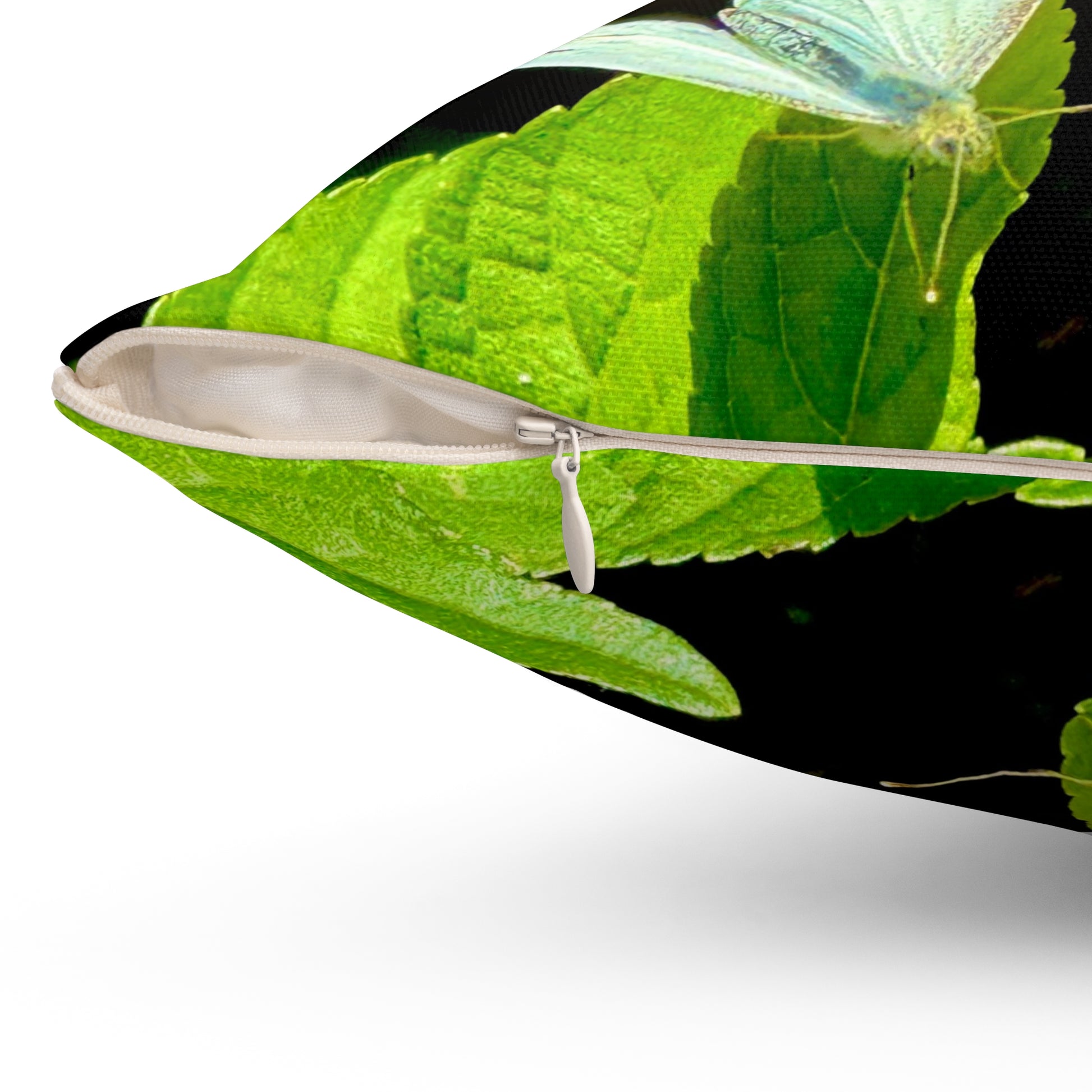 A mystical and enchanting square pillow featuring a fairy with a lantern in a garden surrounded by flowers, fireflies, and a blue butterfly. Perfect for adding a touch of magic to your home decor. Ideal for fairy tale lovers, nature enthusiasts, and those who appreciate whimsical designs. Great for decorating bedrooms, living rooms, or reading nooks. Suitable for gifting on birthdays, holidays, or any special occasion.