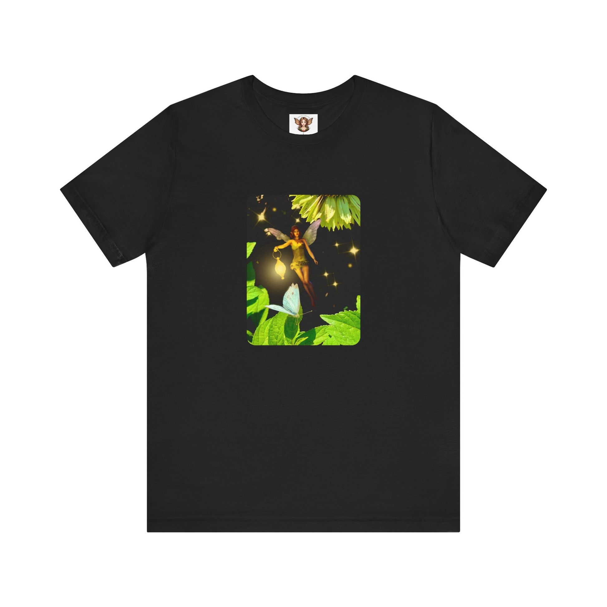 Whimsical and magical T-Shirt featuring a fairy with a lantern in a garden surrounded by flowers, fireflies, and a blue butterfly. Perfect for nature lovers and those who appreciate a touch of magic in their everyday wardrobe. Ideal for casual wear, adding a mystical vibe to any outfit. Relevant for nature-themed events, fantasy enthusiasts, and lovers of whimsical designs.