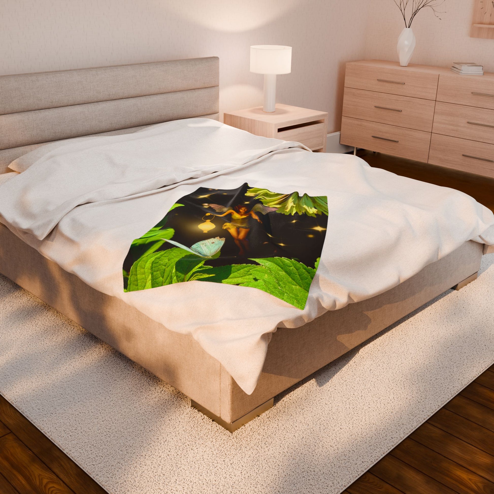Whimsical and magical plush velveteen blanket featuring a fairy with a lantern in a garden surrounded by flowers, fireflies, and a blue butterfly. Perfect for nature lovers and those who appreciate a touch of cozy magic at home. Relevant for nature lovers, fantasy enthusiasts, and lovers of whimsical designs. Size: 30x40".