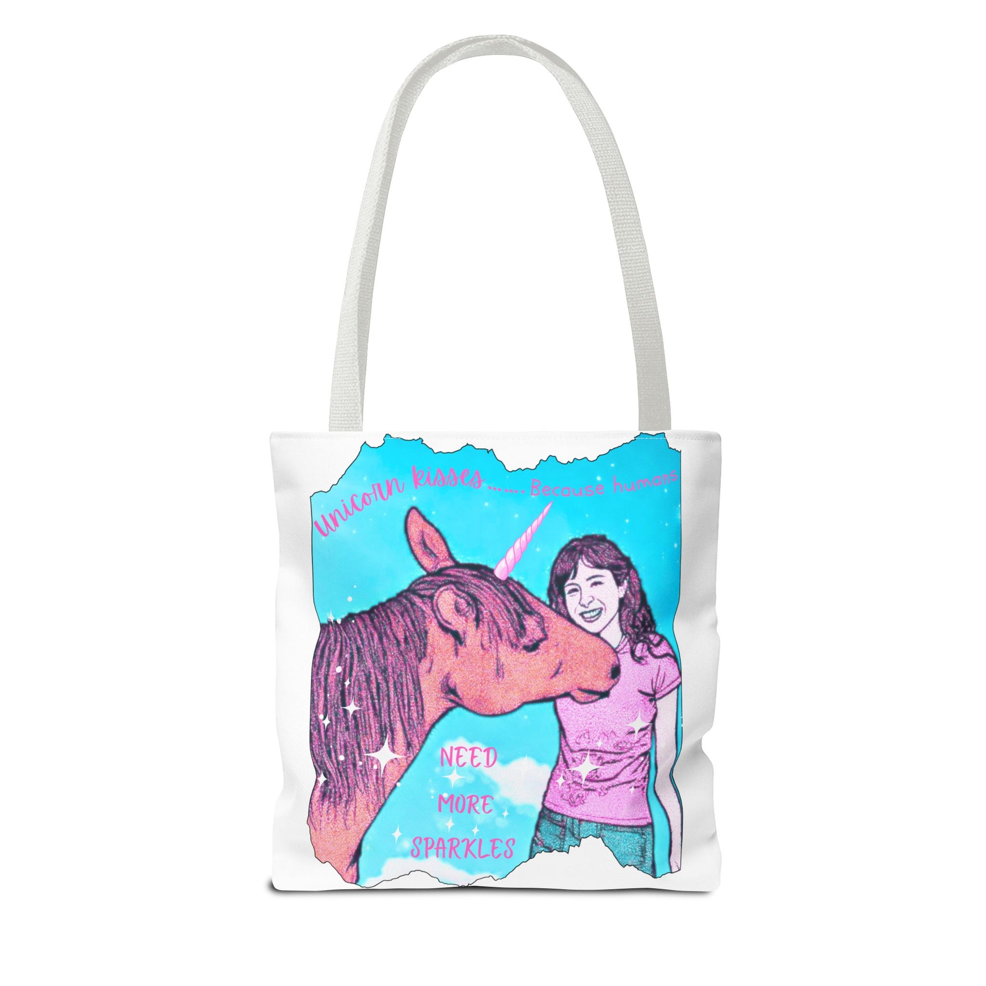 This Tote Bag features a 'unicorn kisses because humans need more sparkles' design, perfect for fantasy enthusiasts who enjoy a magical and whimsical aesthetic. It exudes a fun, cute, and playful vibe, making it a great accessory for everyday use or special occasions such as birthdays or themed events. The Tote Bag offers a large storage compartment, reinforced stitching on handles, and boxed corners for added durability.