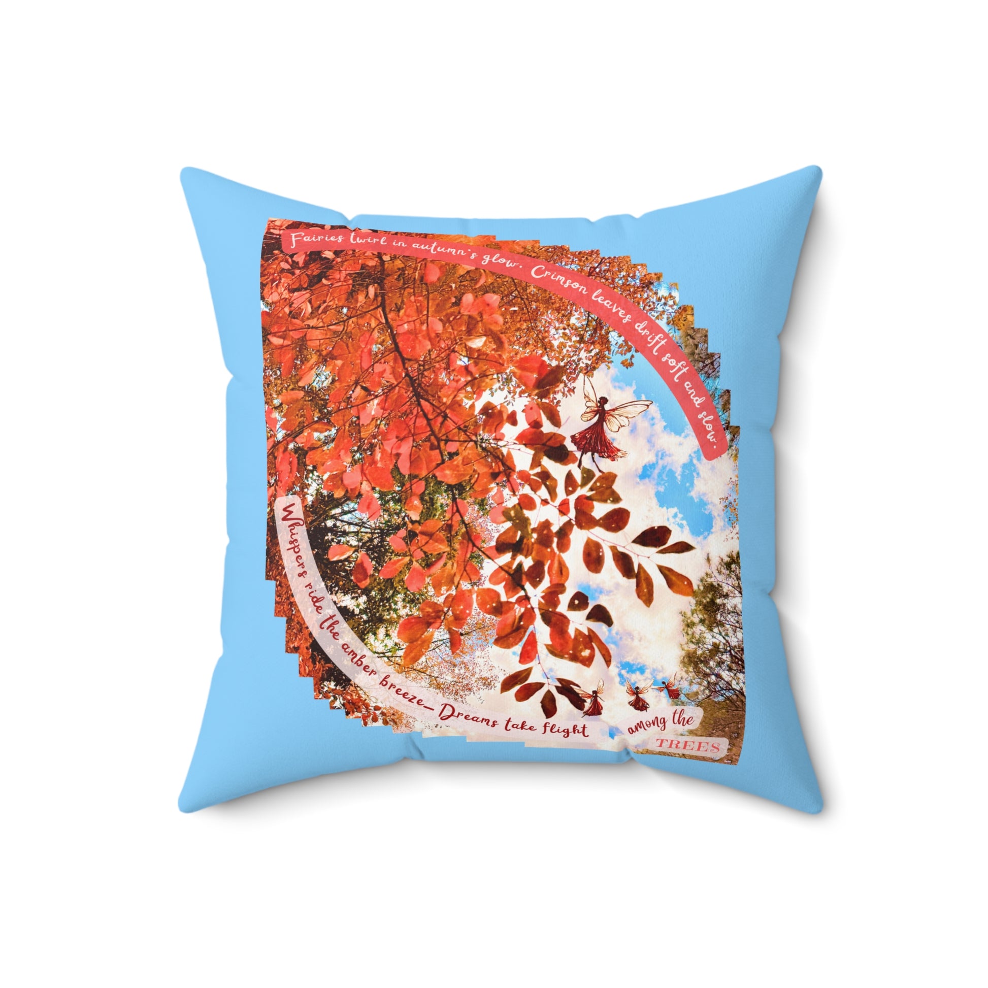 A dreamy and whimsical pillow featuring a design of crimson leaves and blue skies with autumn fairies. Perfect for adding a touch of fantasy to your home decor and a great gift for autumn, Thanksgiving, or birthdays. Ideal for those who love magical and enchanting home accents.