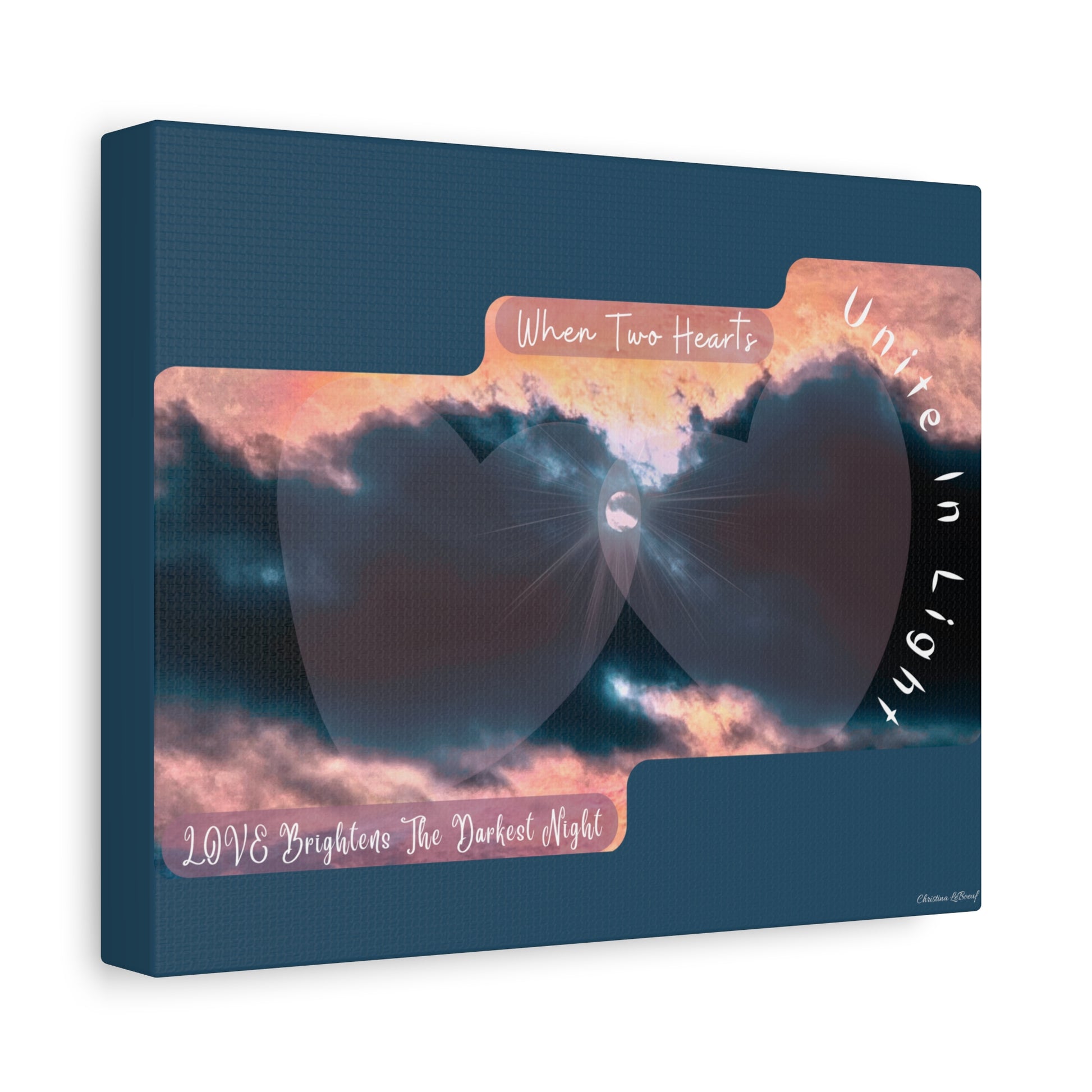 A stretched matte canvas print that captures a stormy sky parting to reveal two hearts united in light. The scene balances dramatic clouds with a warm sunbeam, creating an intimate, hopeful mood—love breaking through even the darkest moments. Hung on a wall, it reads like a quiet promise: an evocative focal piece that brings softness and meaning to a bedroom, living room, or cozy reading nook. The muted, painterly tones and subtle texture of the matte canvas make the imagery feel like a private memory, ready to settle into spaces where quiet reflection and connection matter.