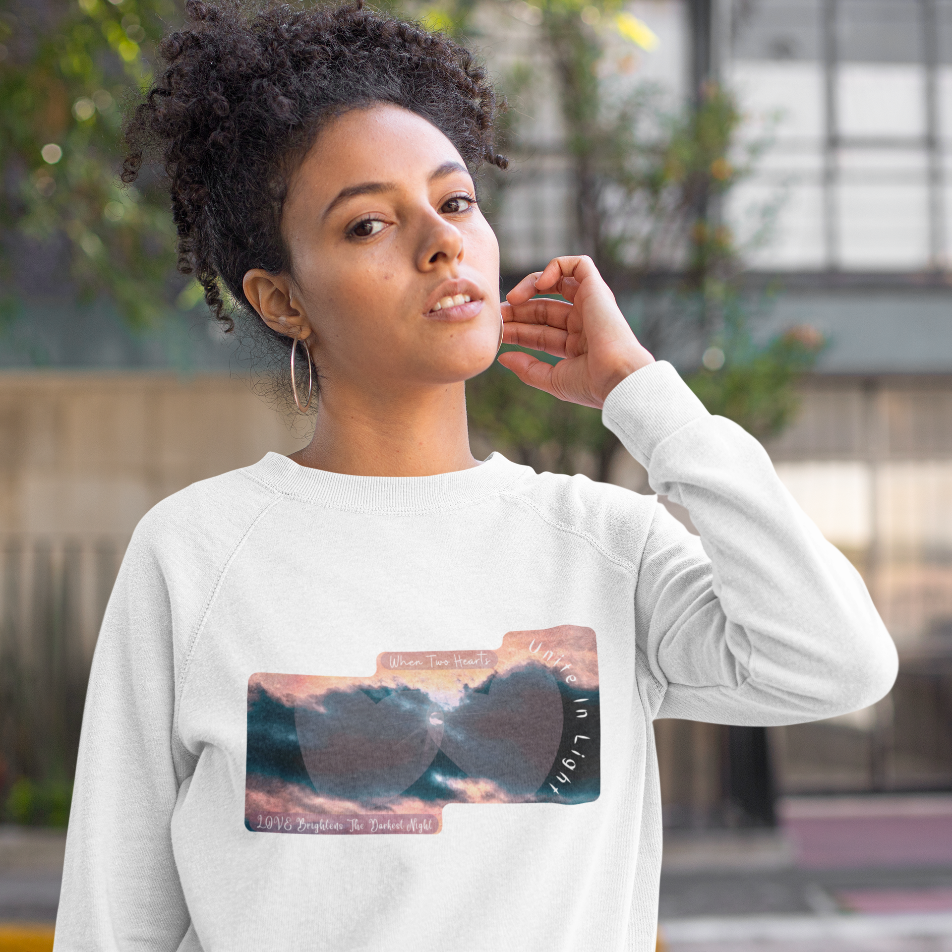 A soft, heart-lit sweatshirt that reads like a quiet vow. A storm sky sets the scene for two hearts joined with the sun breaking through the clouds—an image of steady warmth after a storm. This piece feels like a wearable note: sentimental about love’s quiet strength. It sits comfortably on shoulders and becomes a go-to layer for slow mornings, candlelit anniversaries, or cozy evenings replaying memories. Slip it on and you’ll carry a gentle reminder that even after rough weather, love brings light.